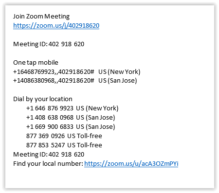 Note: The phone numbers listed may be different than shown below, certainly the meeting ID will be.