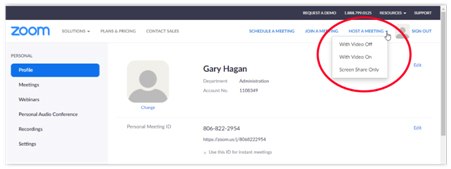 Once logged in you can start your meeting. Click on Host a Meeting at the top right of the window, and select with Video On or with Video Off.