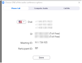 If you are going to join the call yourself via telephone, call one of the phone numbers listed on the pop up window, enter in your meeting ID, and enter in your participant ID when asked.