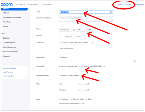 From the main Zoom dashboard window, click on Schedule a Meeting at the top right.